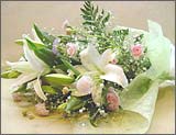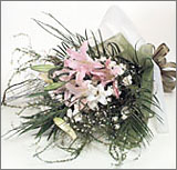 ユリ (白) 、かすみ草 (白)、スプレーカーネーション (淡ピンク)レースフラワー (ピンク)