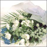 ご仏前にお供えしていただけるような花束です。白・ブルー系でやさしい雰囲気にまとめて、個人を偲び追悼の思いを伝えます。